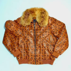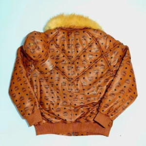 MCM Cognac Monogram Leather Puffer Jacket with Fur Collar & Hat