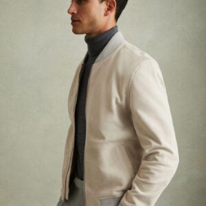 Dolf Men’s Off-White Suede Leather Jacket – Classic Minimal Bomber Style