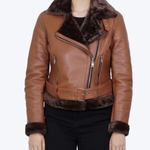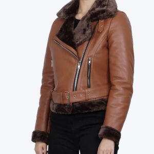 Warm Women’s Asymmetrical Cognac Leather Aviator Jacket with Shearling Lining