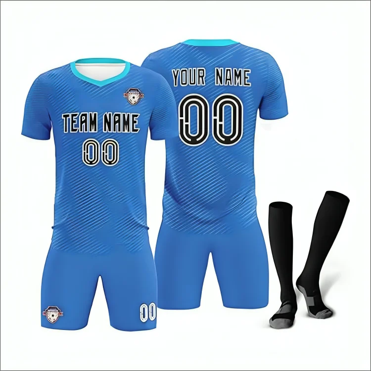 The jersey is engineered with moisture-wicking technology that keeps sweat away, while the breathable mesh panels ensure maximum ventilation during intense matches. The shorts provide a flexible fit with reinforced stitching, allowing freedom of movement for sprinting, kicking, and tackling. Matching socks complete the professional look while offering cushioned support for long hours of play.