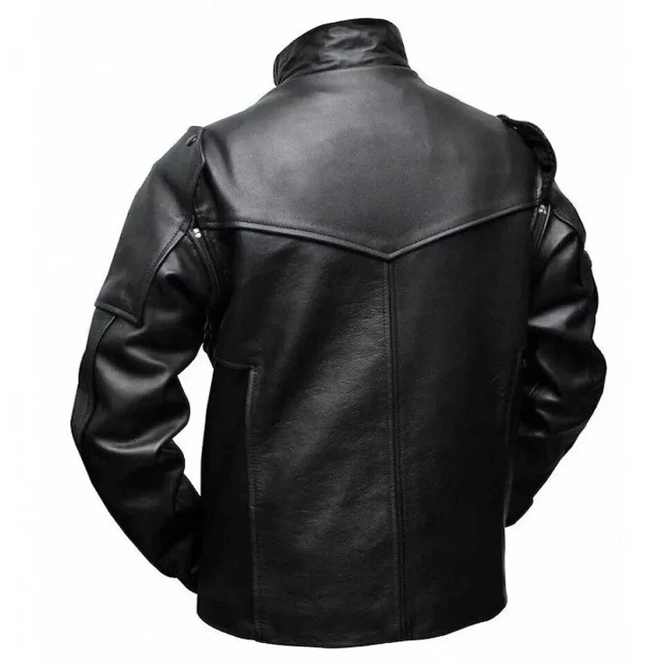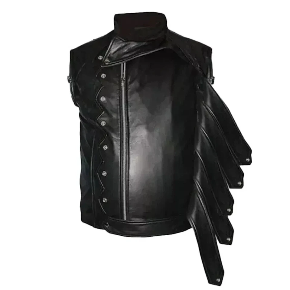 Made from high-quality genuine leather, it delivers durability, comfort, and a premium finish. The jacket’s standout feature is its removable arms, allowing you to transform the look from a full-sleeve leather jacket into a sleeveless vest. This two-in-one design makes it suitable for both cosplay events and casual wear.