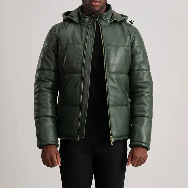 Premium green leather puffer jacket with attached hood.
