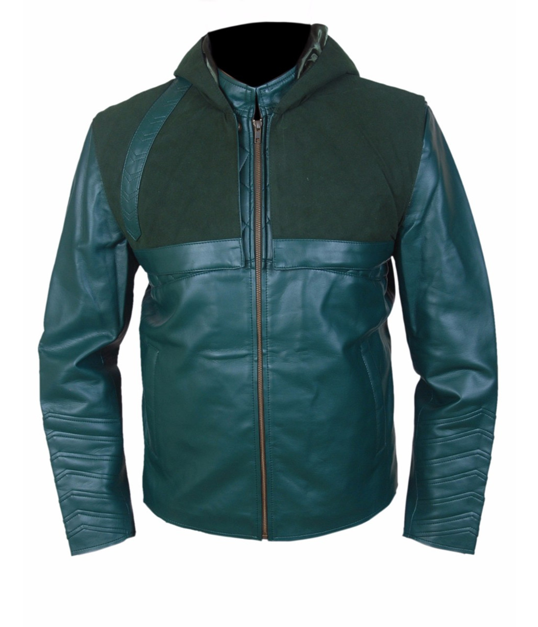 Men’s Arrow Green Leather Jacket with Removable Hood – Stylish & Versatile