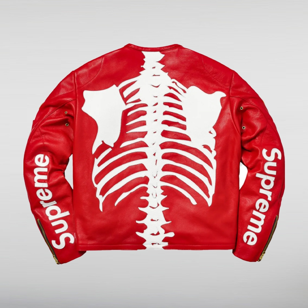 The jacket’s most iconic feature is the signature bone graphic, boldly displayed on the sleeves, chest, and back. This eye-catching design makes it instantly recognizable, embodying the rebellious Supreme aesthetic while reflecting the protective vibe of biker gear.
