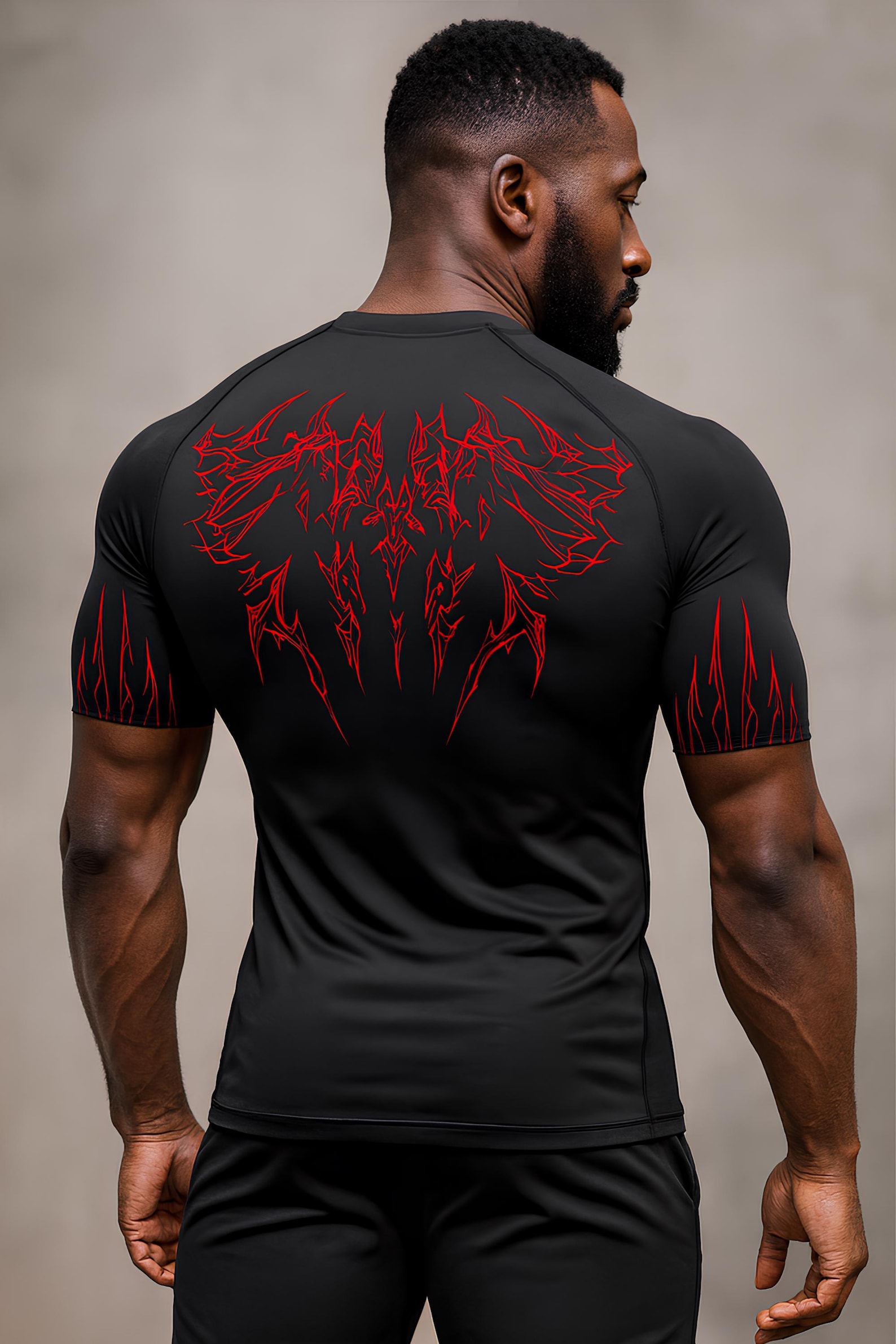 The soft, breathable material wicks away sweat, keeping you cool and dry, while the snug yet flexible fit supports your muscles during intense workouts. Its unisex design ensures it flatters every body type, and the dark gothic print adds a touch of edge to your fitness or streetwear collection.