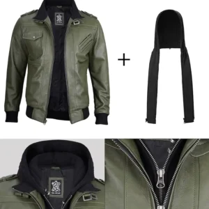 Men’s Military Green Leather Jacket with Removable Hood – Stylish & Versatile
