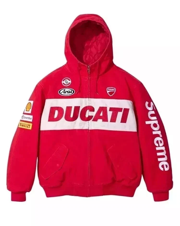 Unisex Red TLJ Supreme Ducati Hooded Biker Handmade Jacket Denim Racing Jacket