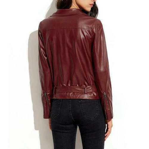 Women’s Burgundy Lambskin Motorcycle Leather Jacket – Slim Fit Genuine Biker